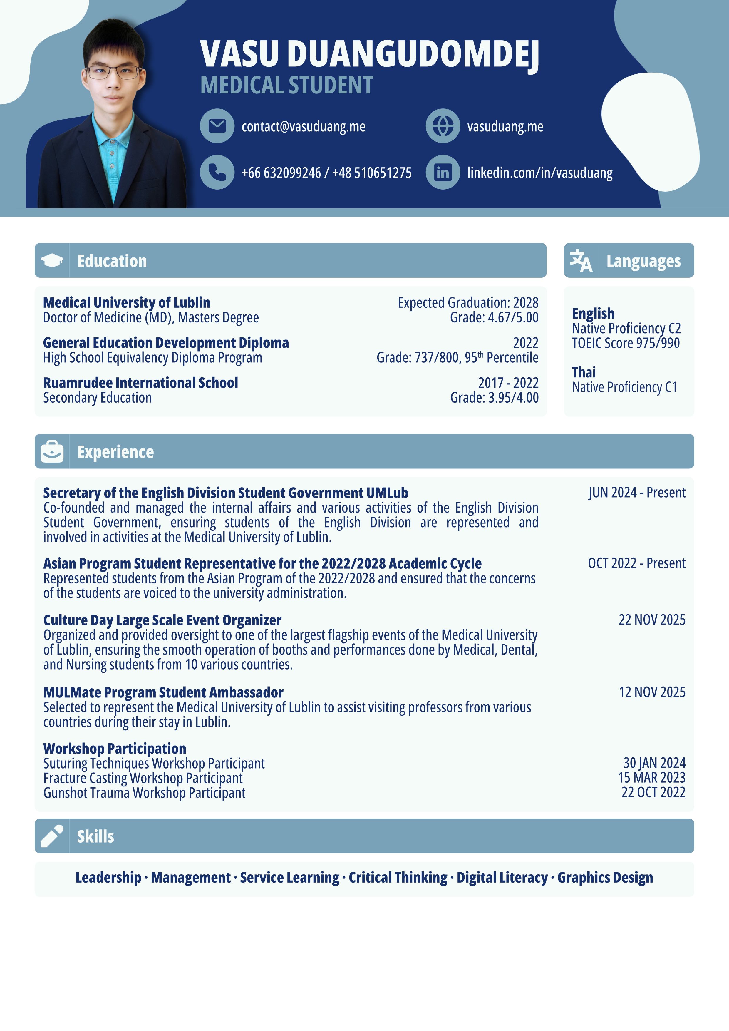 Vasu Duangudomdej is a Medical Student at the Medical University of Lublin. They are the Asian Program Student Representative for the 2022-2028 Study Cycle and Secretary of the English Division Student Government. Their interests include Leadership, Management, and Psychiatry.